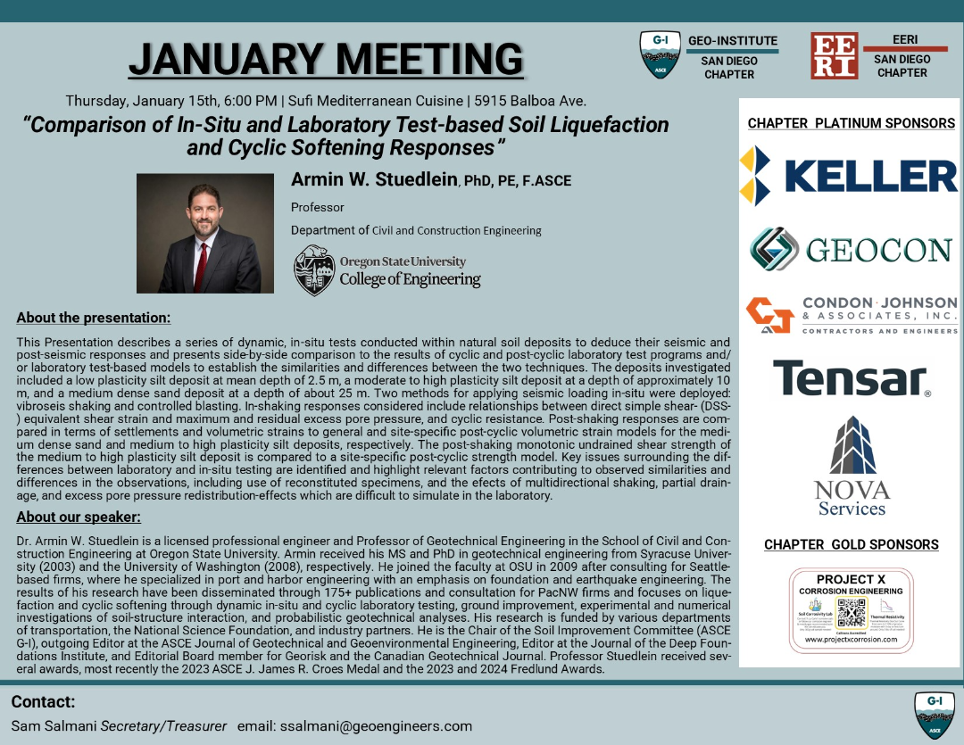 Geo-Institute San Diego Chapter is co-hosting their January Meeting with EERI San Diego, featuring guest speaker Dr. Armin W. Stuedlein, PhD, PE, F.ASCE of Oregon State University. Please join us at Sufi Mediterranean Cuisine to hear about seismic and non-seismic responses of dynamic, in-situ tests.
